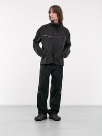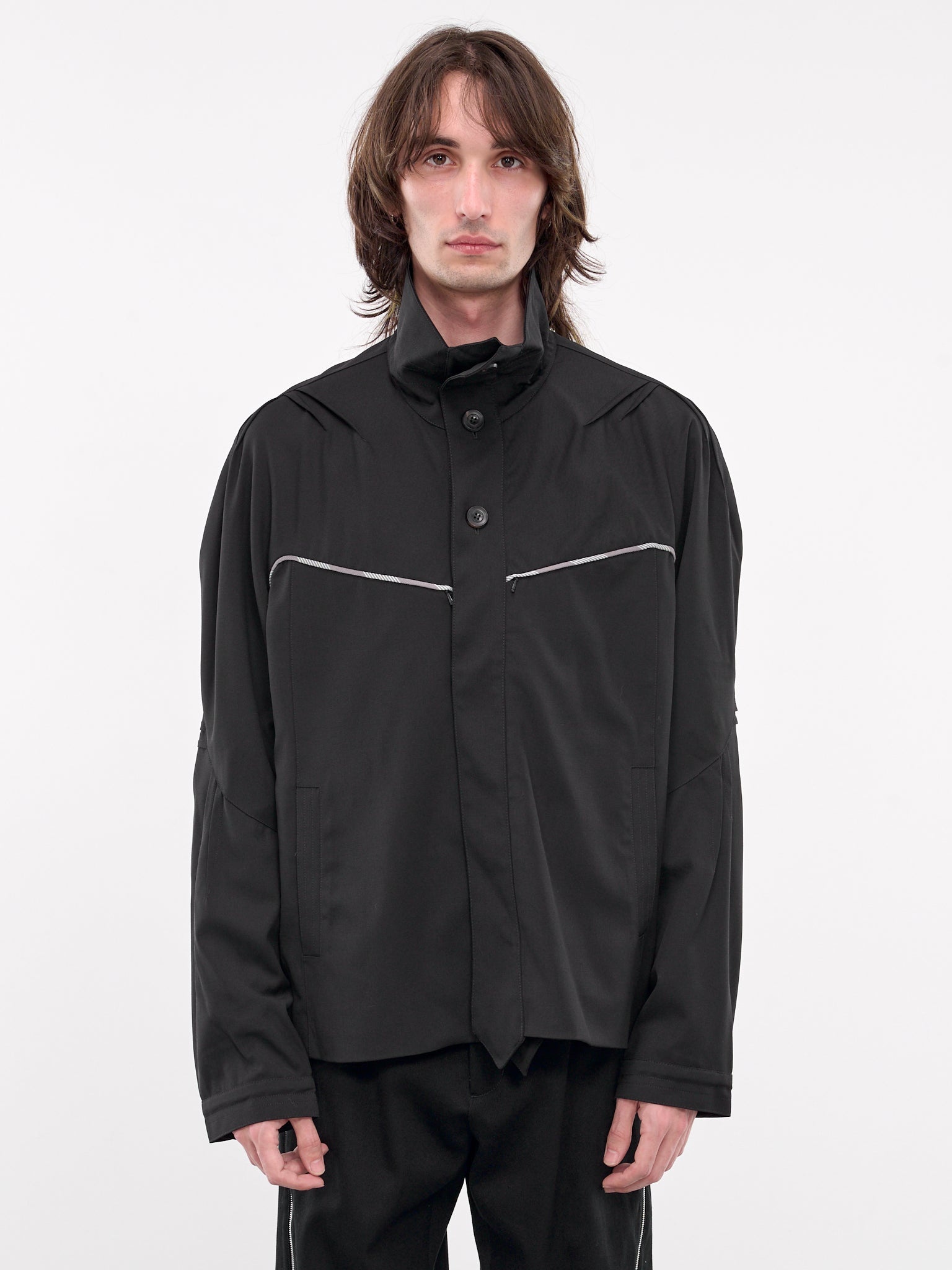 KIKO KOSTADINOV jacket in black, paneled stretch wool construction, stand collar, front buttoned placket closure, shoulder darting, long sleeves, chest piping & zip pockets, side welt pockets, straight hem, regular fit. Made in Bulgaria 97% Virgin Wool 3% Elastane European Sizing Model is 6'1" wearing size 48. Shoulders: 17" Chest: 34" Waist: 28.5"