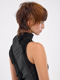 KIKO KOSTADINOV tank in black & dark grey, asymmetric design, paneled corduroy & jersey construction, contrast mixed-material paneling throughout, draping & ruching, wrap-around collar, sleeveless, armscyes, asymmetric hem, slim fit. Made in Bulgaria Fabric 1: 71% Viscose 26% Polyamide 3% Elastane Fabric 2: 48% Polyamide 36% Silk 16% Lycra French Sizing