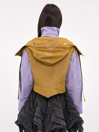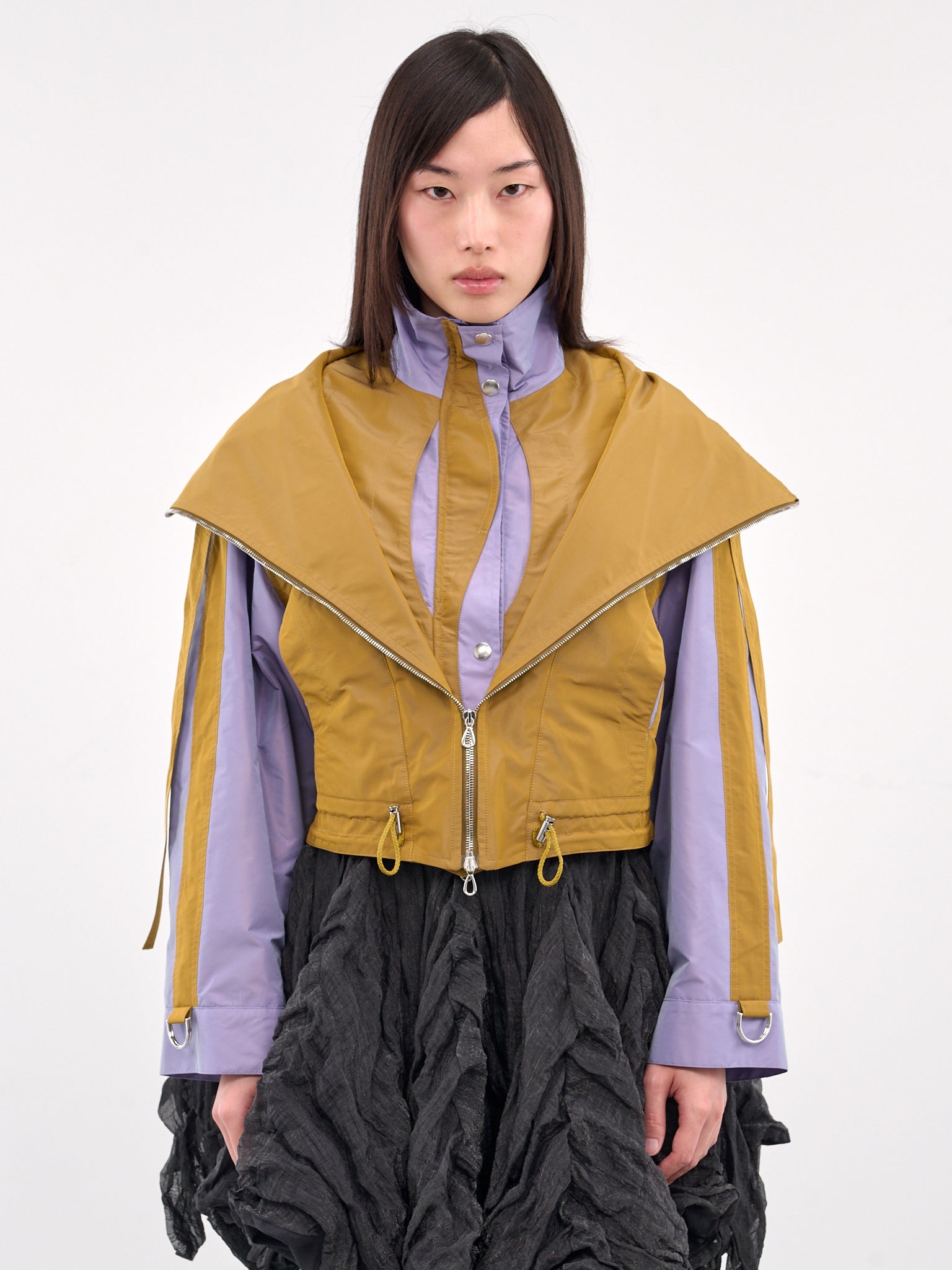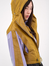 KIKO KOSTADINOV jacket in gold & lavender, paneled construction, contrast two-tone paneling, stand collar, layered wide collar & hood, front layered two-way zip closure & buttoned placket closure, long sleeves, draped straps, D-ring detailing, side pockets, hem adjustable bungee drawcord, angled hem, cropped length, oversized fit. French Sizing Model is 5'8.5" wearing size 36. Bust: 32" Waist: 25" Hips: 35"