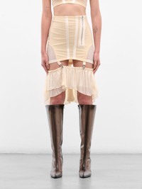 The blonde Uma girdle skirt features semi-sheer and perforated mesh paneling with mixed materials. Garter-style straps and a detachable ruffle skirt accent the high-waisted structure. Featuring: • Slim fit • Semi-sheer and perforated mesh paneling • Mixed-material construction • High-waisted shape • Front zip closure • Garter-style straps at hem with detachable ruffle skirt • Mini-length • Made in UK • 83% Nylon 17% Polyurethane | 55% Polyethylene 40% Cotton 5% Polyurethane | 75% Polyamide 25% Elastane • Standard sizing Model is 5'8" wearing size S. Bust: 28.5" Waist: 22.5" Hips: 33.5"