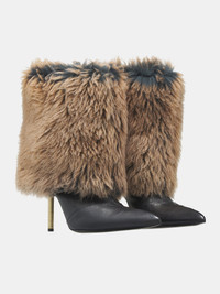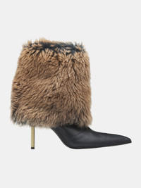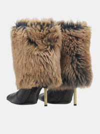KNWLS boots in black & brown, paneled leather construction, mid-height, shearling overlay, metal stiletto heel, pointed toe, leather sole, leather lining. Made in Italy Outer: 100% Calfskin Trim: 100% Sheep Shearling European Sizing
