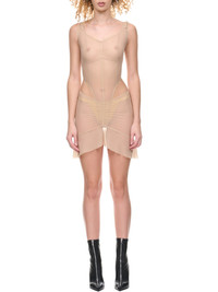 KNWLS dress in beige, paneled construction, stretch nylon mesh, sheer, scoop neck, waist cut-outs, raw hem, mini length, form-fitting. Made in UK Standard Sizing 83% Nylon, 17% Elastane Model is 5'10" wearing size XS. Bust: 28.5" Waist: 22" Hip: 34.5"