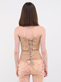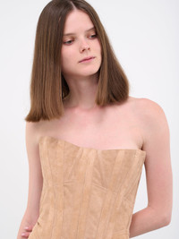 KNWLS skirt in beige, corset bustier design, suede leather, boning details, straight neckline, back zip & lace-up fastening, lined, fitted. Made in UK UK Sizing Body - 100% Cowhide Lining - 100% Cupro Model is 5'10" wearing size 8. Bust: 32" Waist: 24" Hips: 35"