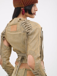 KNWLS jacket in tan, cotton-poly blend, paneled construction, stripe pattern, round neck, buttoned collar, side eyelet & lace-up fastening, back logo patch, long sleeves, cut-outs & lace-up detailing, front exposed zip closure, back lace-up detailing, corset-style hem, slim fit. Made in Italy 80% Cotton 20% Polyester UK Sizing Model is 5'8" wearing size 8. Bust: 32" Waist: 26" Hips: 34.5"