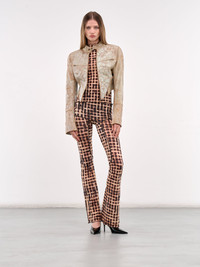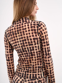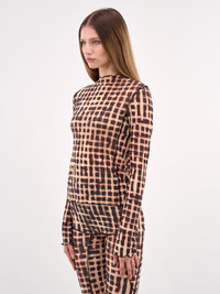 KNWLS top in brown & black, paneled stretch poly construction, all-over bleached plaid pattern, round neck, long sleeves, babylock hem, slim fit. Made in Portugal 83% Polyester 17% Elastane Standard Sizing Model is 5'5" wearing size S. Bust: 32" Waist: 25" Hips: 33"