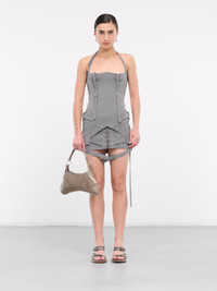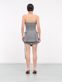KNWLS top in grey, corset-style design, paneled stretch polyethylene twill construction, halterneck, adjustable buckle strap, partially open back, back concealed zip closure, boning, bust adjustable strap detailing, side cut-out, hip buckled strap detailing, high-low hem, slim fit. Made in UK Outer: 96% Polyethylene 4% Polyurethane Inner: 68% Acetate 32% PBT UK Sizing Model is 5'7" wearing size 8. Bust: 31" Waist: 24" Hips: 30"