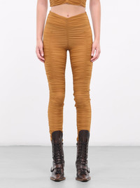 KNWLS pants in orange, draped design, stretch nylon construction, ruching throughout, high-waisted, v-waistline, back concealed zip closure, lined, tapered leg, skinny fit. Made in UK Outer: 83% Polyamide 17% Elastane Inner: 100% Polyester UK Sizing Model is 5'9" wearing size 8. Bust: 32" Waist: 24" Hips: 34"