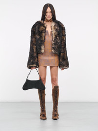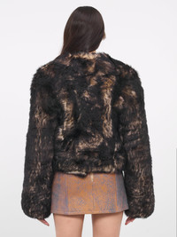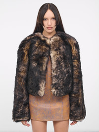 KNWLS jacket in brown & black, shearling-leather construction, round neck, concealed hook & eye closure, long sleeves, straight hem, oversized boxy fit. Made in UK 100% Sheep Leather UK Sizing Model is 5'8" wearing size 8. Bust: 32" Waist: 26" Hips: 34.5"
