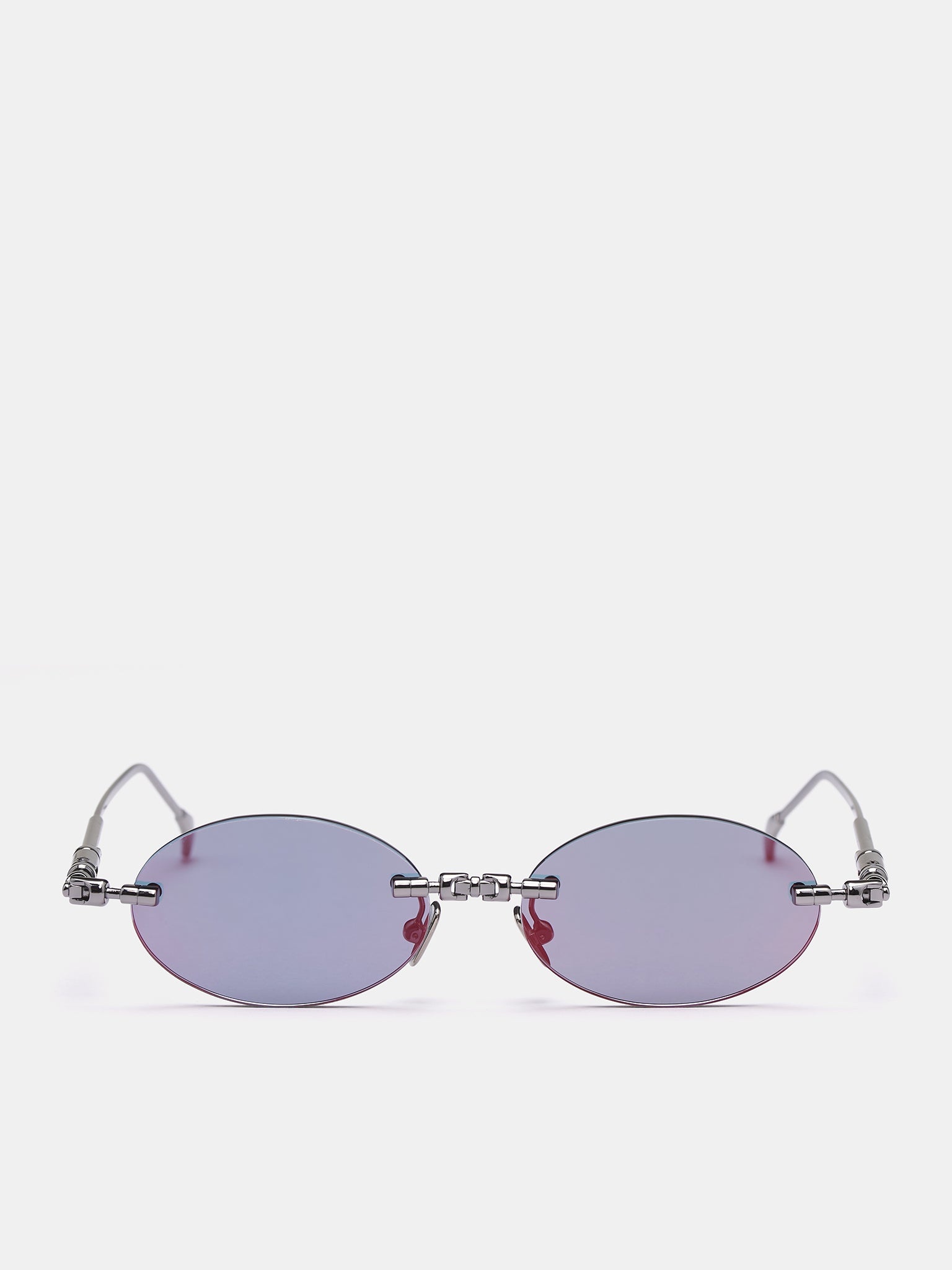 KUBORAUM sunglasses in gold & blue, handmade, metal construction, oval rimless frames, gunmetal finish, hinge embellishments, red & blue gradient-tinted lenses, adjustable nose pads, case included. Made in Italy 100% Metal One Size