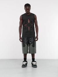 KUSIKOHC t-shirt in black, paneled cotton construction, origami cut-out pattern, crewneck, sleeveless, armscyes, straight hem, regular fit. Made in China 100% Cotton Standard Sizing Model is 5'11" wearing size M. Shoulders: 19" Chest: 38" Waist: 30"