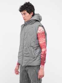 KUSIKOHC vest in grey, paneled polyester construction, graphic quilted pattern, high neck, hood, front concealed two-way zip closure, sleeveless, armscyes, side welt pockets, straight hem, lined, boxy fit. Made in Italy Outer: 100% Polyester Inner: 100% Polyamide Standard Sizing Model is 6'2" wearing size M. Shoulders: 19" Chest: 38" Waist: 30"