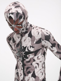 KUSIKOHC grey t-shirt, mask design, stretch polyester construction, abstract pattern, printed compass graphic & text, integrated mask, patterned cut-out, mock neck, long sleeves, straight hem, form fit. Made in Korea 88% Polyester 12% Elastane Standard Sizing Model is 6’2” wearing size M. Shoulders: 19” Chest: 38” Waist: 28”