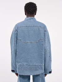KUSIKOHC jacket in blue, paneled denim construction, medium wash, subtle distressing, stand collar, front concealed zip closure, long sleeves, velcro cuffs, front & back logo embroidery, side pockets, straight hem, relaxed fit. Made in Italy 100% Cotton Standard Sizing Model is 5'11.5" wearing size M. Shoulders: 16" Chest: 32.5" Waist: 30"