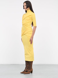 LADO BOKUCHAVA yellow dress, bandage design, turtleneck, mid-sleeves, maxi length, back zip opening, fitted, true to size. Made in Georgia 78% Polyester, 22% Spandex Standard Sizing Model is 5'8" wearing size S. Bust: 32" Waist: 26" Hips: 34.5"