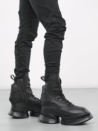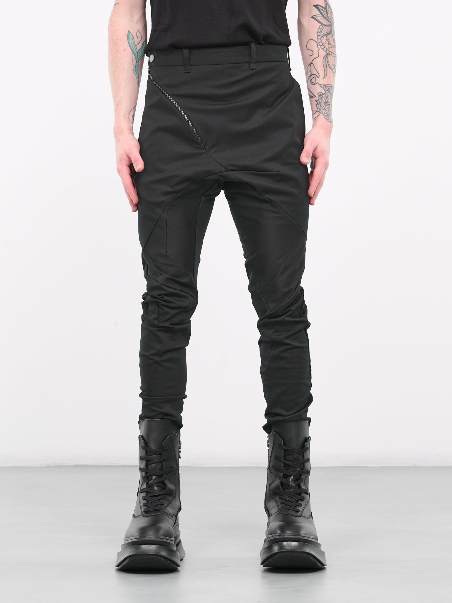 LEON EMANUEL BLANCK trousers in black, eco dry cotton twill construction, asymmetric paneling, belt loops, off-set button & exposed zip closure, side seam pockets, tapered leg, skinny fit. Made in Germany 96% Cotton 4% Elastane European Sizing Model is 6’0” wearing size 48. Shoulders: 19" Chest: 38” Waist: 30”
