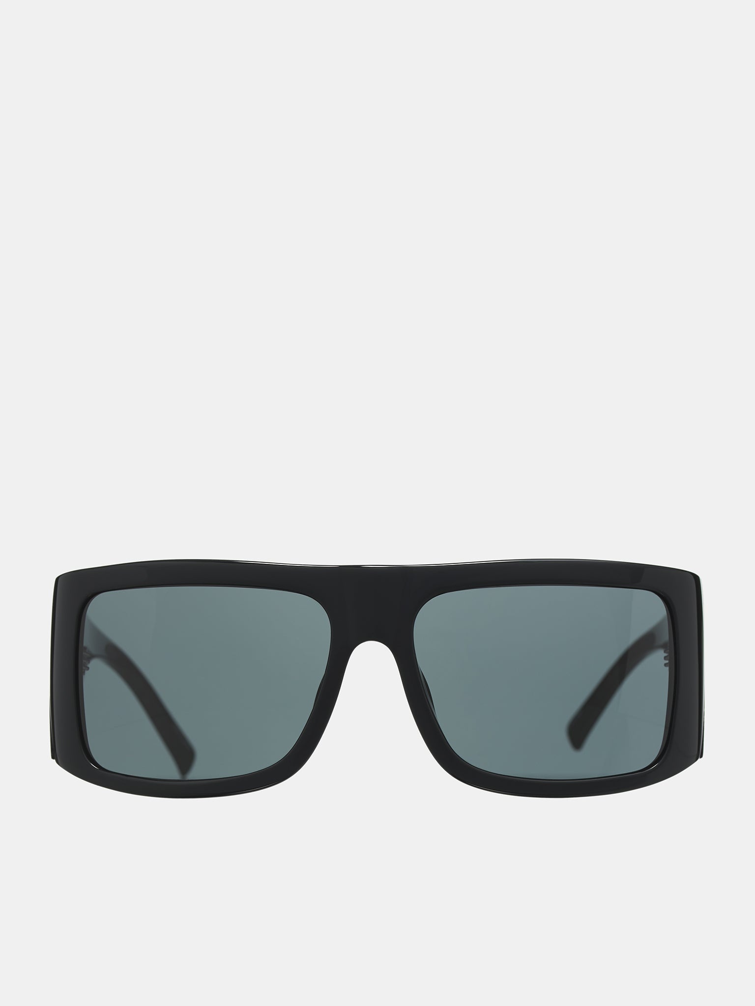 LINDA FARROW x THE ATTICO sunglasses in black, acetate construction, oversized rectangular frame design, glossy finish, grey-tinted lenses, temple logo detailing, fixed nose pads, case included. Made in Japan Acetate One Size