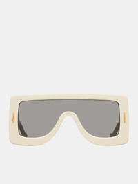 LOEWE sunglasses in ivory, mask design, acetate construction, gray lenses, UVA/UVB protection, integrated nose pads, gold-toned anagram logo detail, leather pouch included. Made in Italy 100% Acetate