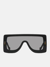 LOEWE sunglasses in black, mask design, acetate construction, gray lenses, UVA/UVB protection, integrated nose pads, gold-toned anagram logo detail, leather pouch included.  Made in Italy 100% Acetate
