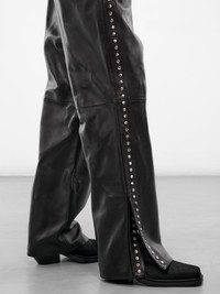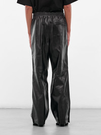 The black trousers are crafted in smooth lambskin with a straight leg and relaxed fit, detailed by an elasticated waistband, adjustable drawstring, and press-stud side embellishments. Featuring: • Relaxed fit and straight leg • Elasticated waistband with adjustable drawstring • Three-pocket styling • Side press-stud embellishment and vents • Lined construction • Made in Spain • Outer: 100% Lambskin | Lining: 95% Viscose 5% Cotton • Standard sizing Model is 6'2" wearing size M. Shoulders: 19" Chest: 38" Waist: 29"