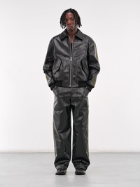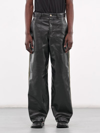 LOEWE pants in black & khaki, paneled Nappa leather & cotton construction, two-tone paneling, belt loops, back logo patch, front button & concealed zip fly closure, side pockets, back welt pocket, side cargo pockets, lined, wide leg, loose fit. Made in Italy Outer: 50% Cotton 50% Calf Skin Inner: 100% Cotton European Sizing Model is 6’2” wearing size 48. Shoulders: 19” Chest: 38” Waist: 28”