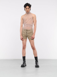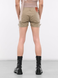 LUDOVIC DE SAINT SERNIN shorts in beige, paneled denim construction, mid-rise, belt loops, back logo patch, front lace-up fastening, inset pockets, coin pocket, back patch pockets & metal eyelets, side lace-up embellishment, straight hem, mini-length, slim fit. 100% Cotton Standard Sizing Model is 6'2" wearing size M. Shoulders: 19" Chest: 38" Waist: 28"
