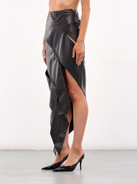 LUDOVIC DE SAINT SERNIN skirt in black, paneled lamb leather construction, high-waist, bias spiral paneling & lace-up fastening, self-tie fastening, cut-outs & slits, asymmetric draping & hem, midi-length, slim fit. Made in Turkey 100% Lamb Leather Standard Sizing Model is 5'8" wearing size S. Bust: 32.5" Waist: 24" Hips: 34"