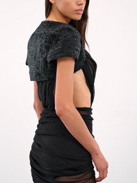 LUDOVIC DE SAINT SERNIN bolero in black, goose feather construction, rounded neck, open front, short sleeves, half back paneling, cropped length, slim fit. Made in France 100% Goose Feathers One Size Model is 5'8" wearing size OS. Bust: 32.5" Waist: 24" Hips: 34"