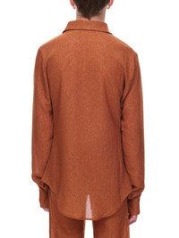 LUDOVIC DE SAINT SERNIN shirt in terracota, semi-sheer, stretch-fabric, pointed collar, button closure, elongated length, curved hem, slim fit, gender-neutral. Made in France Standard Sizing 100% Polyester Model is 5'11" wearing size S. Shoulders: 18" Chest: 34" Waist: 29"
