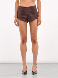 LUDOVIC DE SAINT SERNIN shorts in brown, paneled cotton construction, striped contrast pattern, mid-waist, side metal eyelets & lacing, self-tie fastening, angled hem, micro-length, slim fit. Made in France 100% Cotton Standard Sizing Model is 5'8" wearing size S. Bust: 32.5" Waist: 24" Hips: 34"
