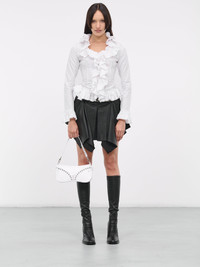 LUDOVIC DE SAINT SERNIN shirt in white, cotton poplin construction, ruffled scoop neck, front zip closure, long sleeves, flared cuffs, ruffle-trimmed cuffs & hem, full length, slim fit. Made in France 100% Cotton Standard Sizing Model is 5'8" wearing size S. Bust: 32" Waist: 26" Hips: 34.5"