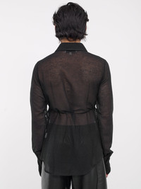 LUDOVIC DE SAINT SERNIN shirt in black, paneled leather & hemp construction, semi-sheer, spread collar, front buttoned placket closure, long sleeves, single-button barrel cuffs, waist self-tie belt & eyelets, shirttail hem, slim fit. Made in France 70% Hemp 30% Leather Standard Sizing Model is 6'2" wearing size M. Shoulders: 19" Chest: 38" Waist: 28"