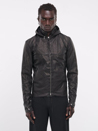 MA+ jacket in black, paneled leather construction, full grain, shirt collar, zip detachable hood, front exposed two-way zip closure & leather zip pulls, long sleeves, diagonal zip cuffs, chest pockets, side pockets, curved hem, slim fit. Made in Italy 100% Cow Leather European Sizing Model is 5'11" wearing size 50. Shoulders: 19" Chest: 38" Waist: 30"