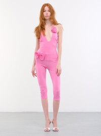 MAGDA BUTRYM pants in pink, 3D flower detailing, stretch jersey, mid-elastic waist, cropped, fitted. Made in Poland Italian Sizing 85% Viscose, 15% Elastane Model is 5'9" wearing size 36. Bust: 31.5" Waist: 23" Hips: 34"