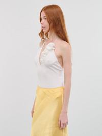 MAGDA BUTRYM bodysuit in white, halter design, 3D flower detailing, stretch jersey, criss-cross straps, center keyhole cut-out, fitted. Made in Poland Italian Sizing 85% Viscose, 15% Elastane Model is 5'9" wearing size 36. Bust: 31.5" Waist: 23" Hips: 34"