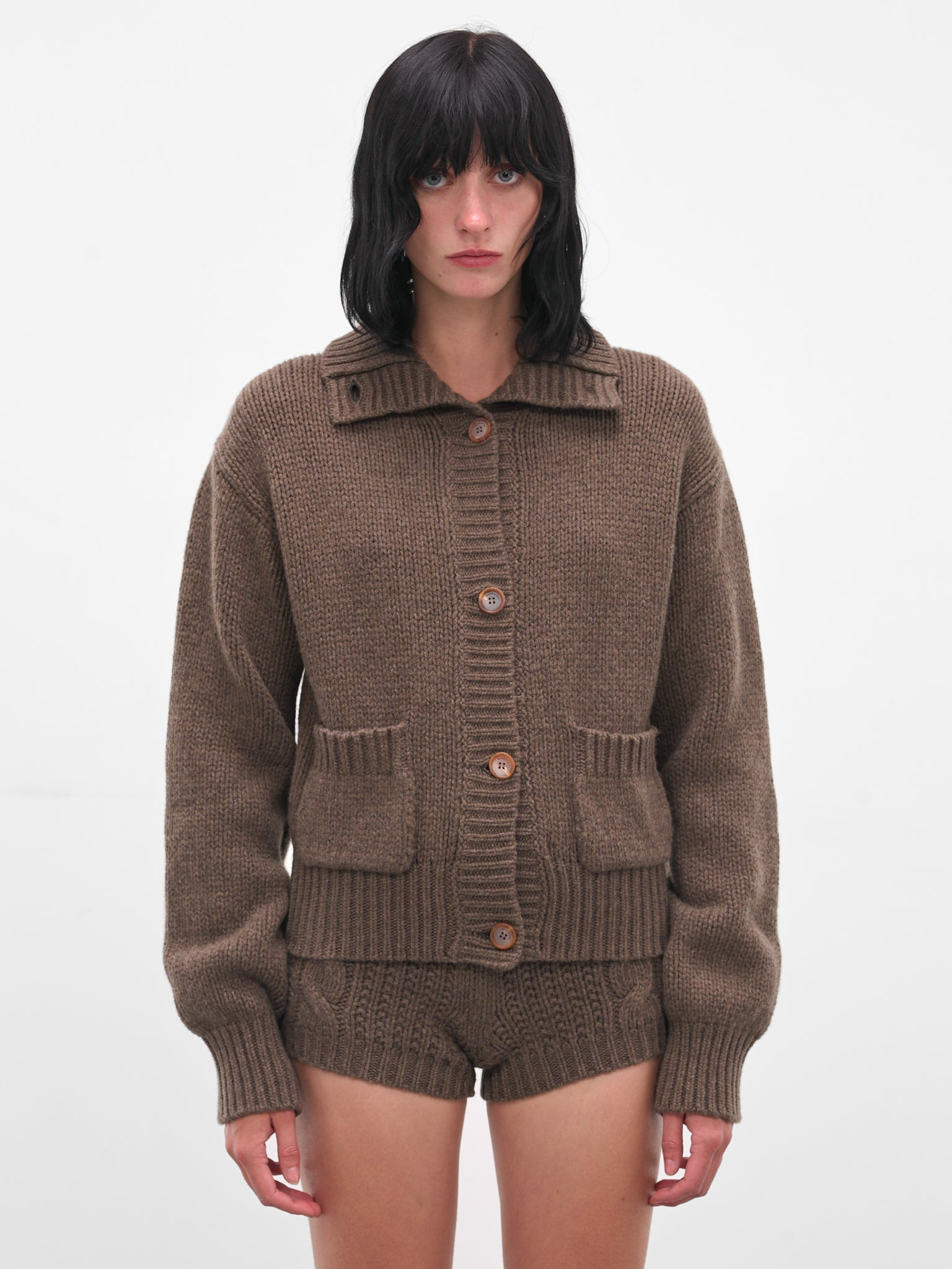 A brown cropped cashmere cardigan with exaggerated front patch pockets and a sculptural ribbed hem. Features a high button-up neckline and a chunky textured knit. Featuring: • Relaxed fit • Chunky cashmere knit construction • High button-up neckline • Cropped length • Exaggerated front patch pockets • Ribbed hem and cuffs • Made in Italy • 100% Cashmere • French sizing Model is 5'7" wearing size 36. Bust: 32" Waist: 25" Hips: 34"