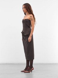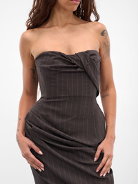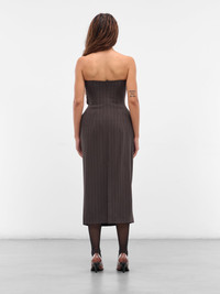 A brown wool pinstripe dress with a twisted sweetheart neckline. The gathered draping at the hip and structured bust lend fluid architecture to the fitted silhouette. Featuring: • Slim fit • Wool construction with pinstripe pattern • Strapless with sweetheart neckline • Twisted detailing at bust • Gathering and draping at hip and front • Back concealed zip closure and vent • Silk lining, midi length • Made in Poland • Outer: 97% Wool 3% Polyamide | Lining: 100% Silk • French sizing Model is 5'8" wearing size 34. Bust: 33” Waist: 25.5” Hips: 34”