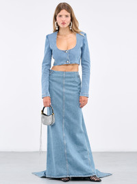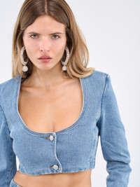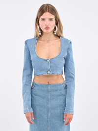 MAGDA BUTRYM jacket in blue, ultra cropped design, denim construction, scoop neck, metal button closure & cuffs, slim fit. Italian Sizing 100% Cotton Model is 5'7" wearing size 36. Bust: 32" Waist: 24" Hips: 34"
