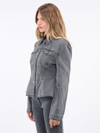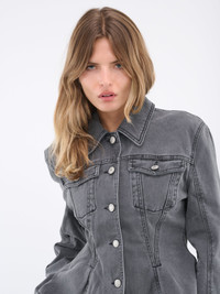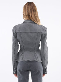 MAGDA BUTRYM jacket in grey, denim construction, pointed collar, button closure & cuffs, dual chest flap pockets, cinched waist, darting flared hem, slim fit. Italian Sizing 100% Cotton Model is 5'7" wearing size 36. Bust: 32" Waist: 24" Hips: 34"