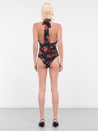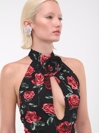MAGDA BUTRYM black bodysuit, stretch jersey, rose print, thick halter tie, mock neck, detachable brooch, keyhole cut-out, open back, fitted. 92% Viscose, 8% Elastane Italian Sizing Model is 5'9" wearing size 8. Bust: 32" Waist: 24" Hips: 34"