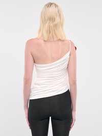 MAGDA BUTRYM blouse in cream, paneled stretch viscose construction, ruching & draping throughout, one-shoulder strap, shoulder rose applique, sleeveless, armscyes, asymmetric hem, slim fit. Made in Poland 96% Viscose 4% Elastane French Sizing Model is 5'11" wearing size 34. Bust: 31.5" Waist: 25" Hips: 36"