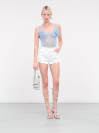 MAGDA BUTRYM bodysuit in blue, paneled stretch jersey construction, semi-sheer, scoop neck, shoulder straps, sleeveless, armscyes, rose appliqué, form fit. Made in Poland 92% Cupro 8% Elastane French Sizing Model is 5'9" wearing size 34. Bust: 32" Waist: 24" Hips: 34"