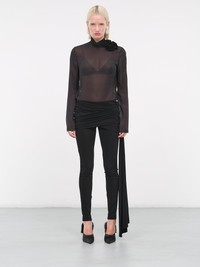 MAGDA BUTRYM black blouse, sheer design, silk construction, high-neck, embellished floral appliqué, long sleeves, regular fit. Made in Poland 100% Silk European Sizing Model is 5'9" wearing size 36. Bust: 32" Waist: 24" Hips: 34"
