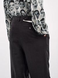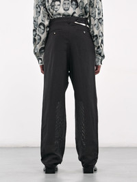 MAGLIANO pants in black, paneled construction, semi-sheer, high waist, deconstructed overlapping waistbands, front concealed zip fly closure, pleated, side pockets, back welt pockets, wide leg, relaxed fit. Standard Sizing Model is 6'1" wearing size M. Shoulders: 15.5" Chest: 31" Waist: 26"