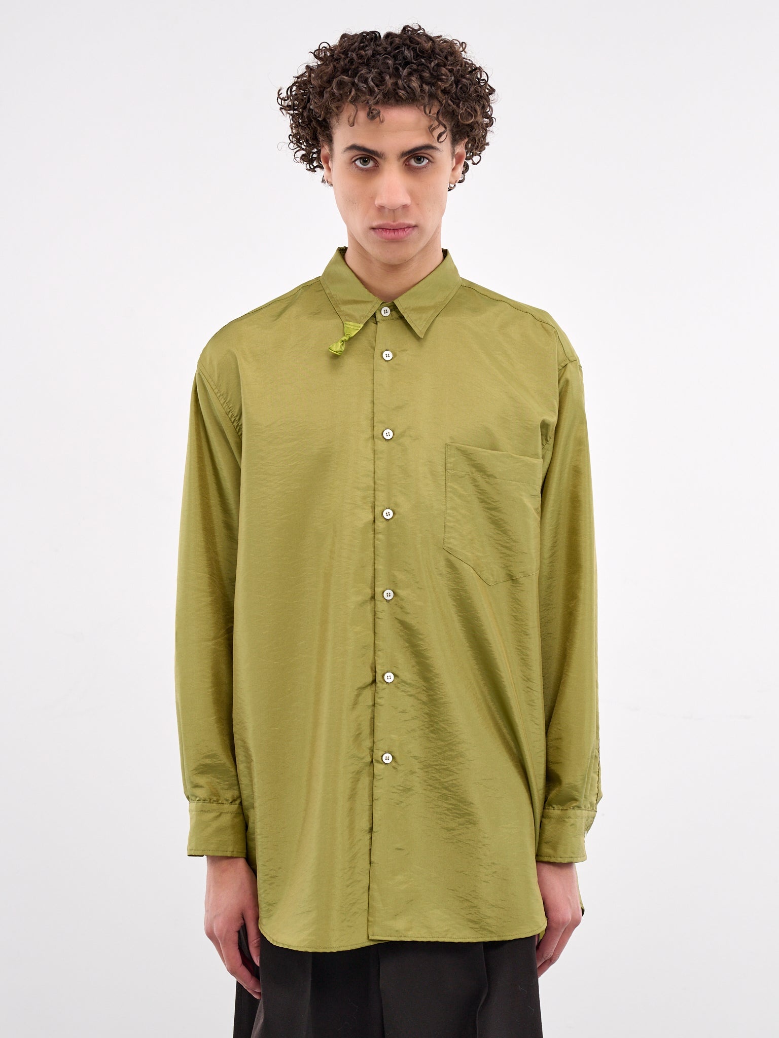 MAGLIANO shirt in olive, nylon-poly blend, paneled construction, pointed collar, collar tie detailing, front button placket closure, long sleeves, button cuffs, chest patch pockets, shirttail hem, relaxed fit. Made in Italy 55% Polyamide 45% Polyester Standard Sizing Model is 6'2" wearing size M. Shoulders: 19" Chest: 38" Waist: 29"