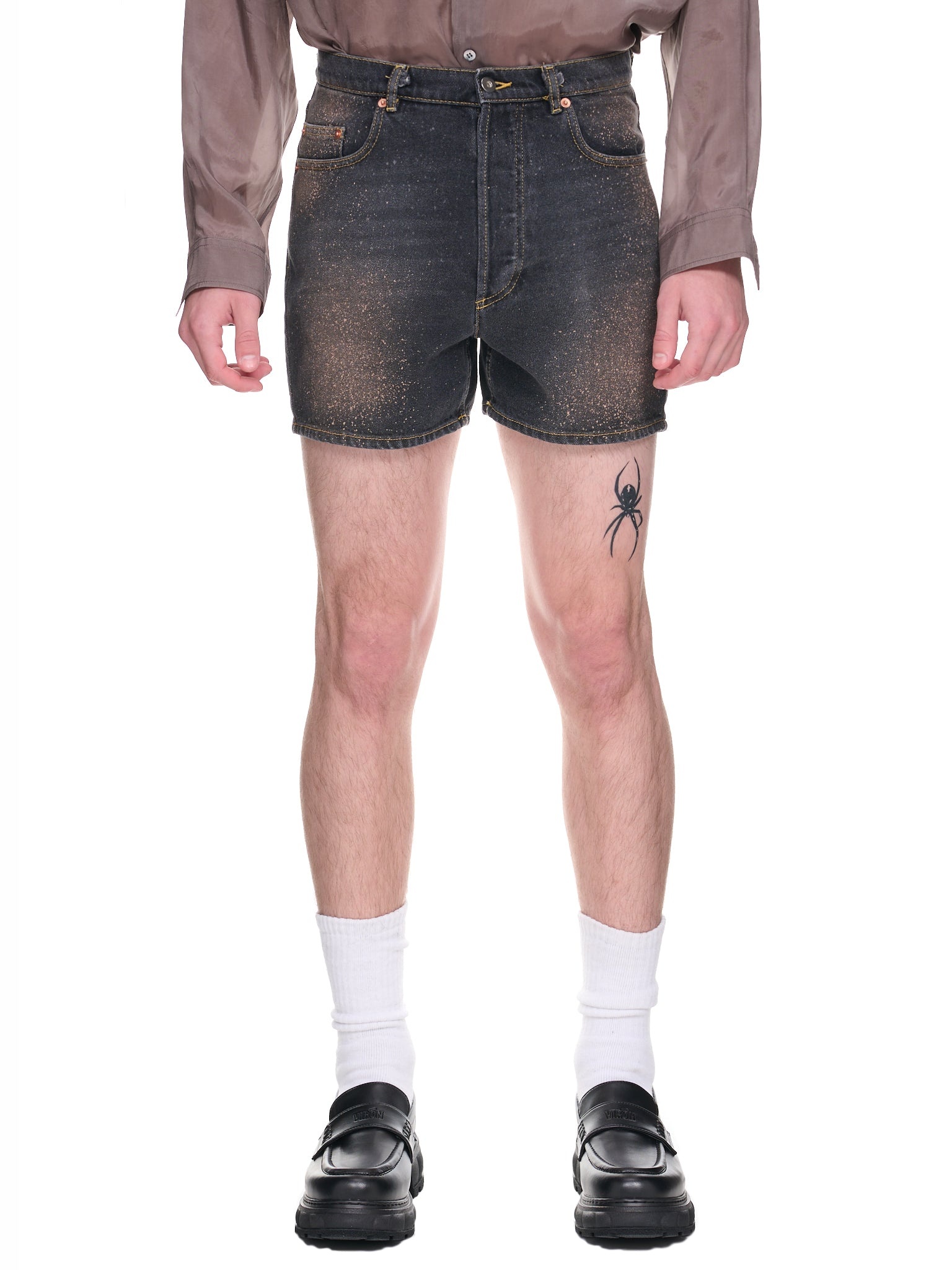 MAGLIANO shorts in black, mini length design, irregular stained wash denim, twisted seams, mid-waist, belt loops, button zip-fly, five-pockets, back logo patch, slim fit. Made in Italy Standard Sizing 100% Cotton Model is 6’2” wearing size M. Shoulders: 18.5” Chest: 35” Waist: 29”