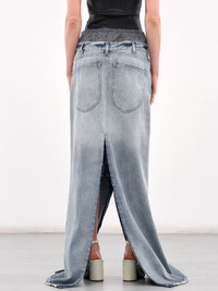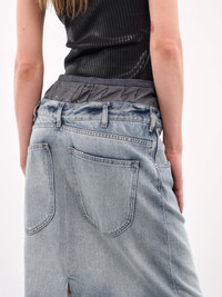 MAISON MARGIELA skirt in blue, paneled denim construction, distressed, faded, high waist, layered waistbands, front button & concealed zip fly closure, back signature stitch detailing, belt loops, inset pockets, coin pocket, back patch pockets, front & back deep slits, floor-length, relaxed fit. Made in Italy 100% Cotton Italian Sizing Model is 5'9" wearing size 38. Bust: 32" Waist: 23" Hips: 34"