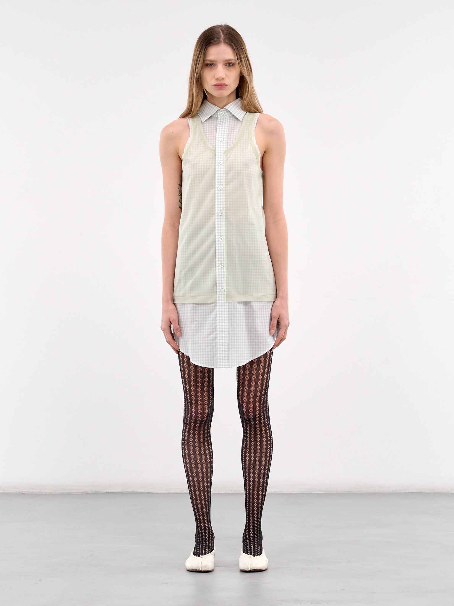 MAISON MARGIELA shirt in light grey, two-way multi-wear design, layered polyester construction, check pattern, spread collar, back button placket closure, back signature stitch detailing, sleeveless, armscyes, sheer overlay, shirttail hem, relaxed fit. Made in Italy 100% Polyester Italian Sizing Model is 5'9" wearing size 40. Bust: 32" Waist: 23" Hips: 34"