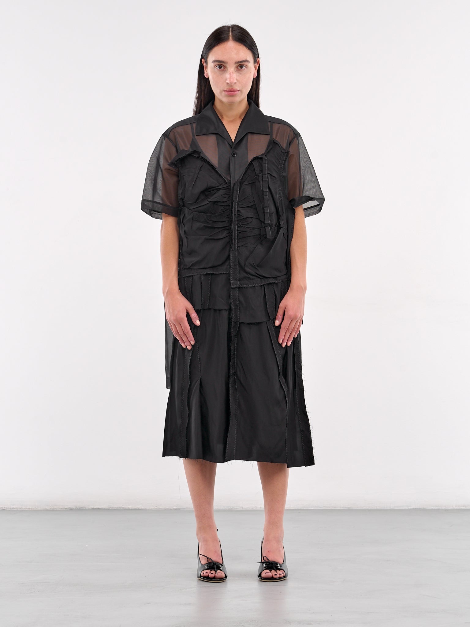 MAISON MARGIELA dress in black, paneled mixed-material construction, sheer paneling, deconstructed embellishment throughout, spread collar, front button placket closure, pleating & wrinkling, deconstructed & raw hems, asymmetric draping, straight hem, midi-length, relaxed fit. Italian Sizing Model is 5'6" wearing size 40. Bust: 31" Waist: 24" Hips: 34"