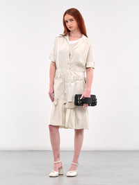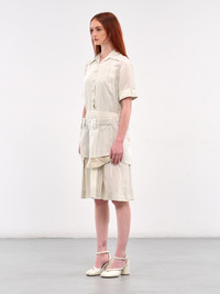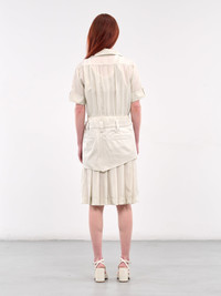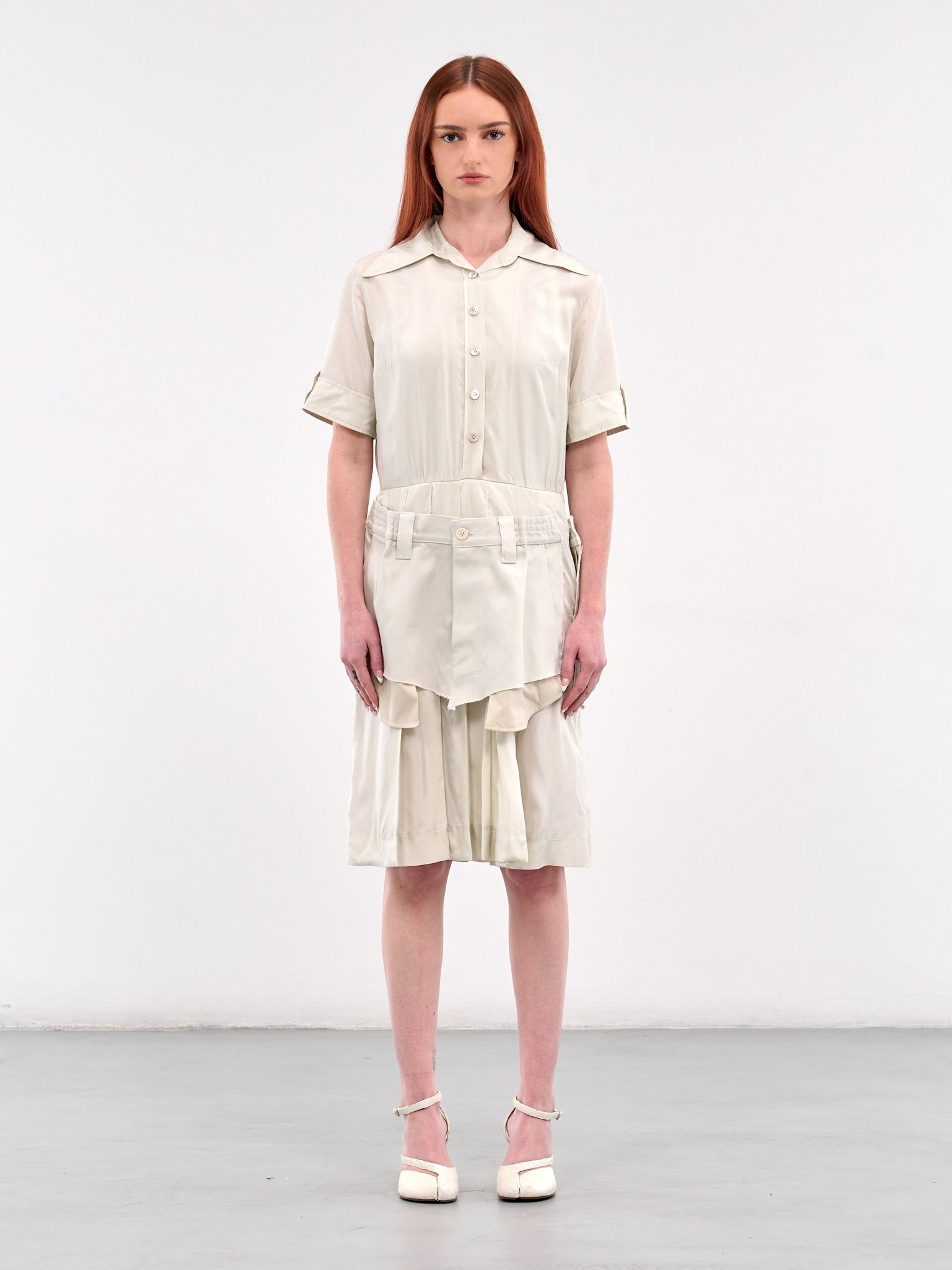 MAISON MARGIELA dress in light grey, deconstructed dress design, paneled construction, deconstructed embellishment throughout, wide spread collar, short sleeves, button cuffs, front button placket closure, deconstructed cut-off pants detailing, raw hems, pleated hem, mini-length, relaxed fit. Italian Sizing Model is 5'6" wearing size 40. Bust: 32" Waist: 23" Hips: 35"