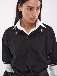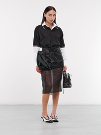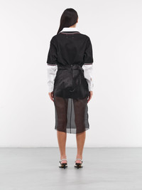 MAISON MARGIELA dress in black, layered hybrid design, paneled mixed-material construction, layered spread collars, front quarter-button placket closure, layered sleeves, buttoned barrel cuffs, waist decortique details, side ruffle, back signature stitch detailing, sheer paneled skirt, straight hem, midi-length, relaxed fit. Made in Italy Primary: 100% Cotton Secondary: 50% Silk 50% Cotton European Sizing Model is 5'6" wearing size 40. Bust: 31" Waist: 24" Hips: 34"